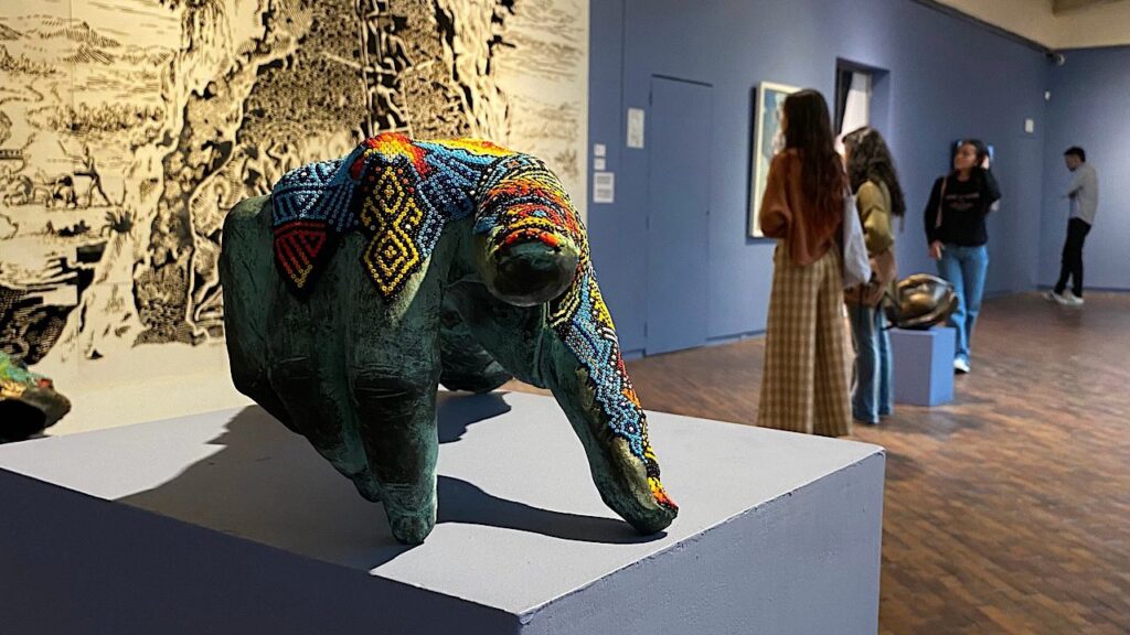 Por último, en los niveles 1 y 3, las obras de Carlos Castro Arias nos invitan a reflexionar sobre la influencia perdurable del pasado en el presente latinoamericano. A través de la apropiación de imágenes históricas y la recontextualización de objetos encontrados, Castro Arias nos desafía a reconsiderar los ideales del modernismo y a confrontar las realidades políticas y sociales de la región. Su exposición, titulada «El pasado nunca muere. No es ni siquiera pasado», nos sumerge en un mundo de mitos y memorias, donde figuras del arte universal se entrelazan con la historia nacional de Colombia en una danza de chakiras y patrones visuales.